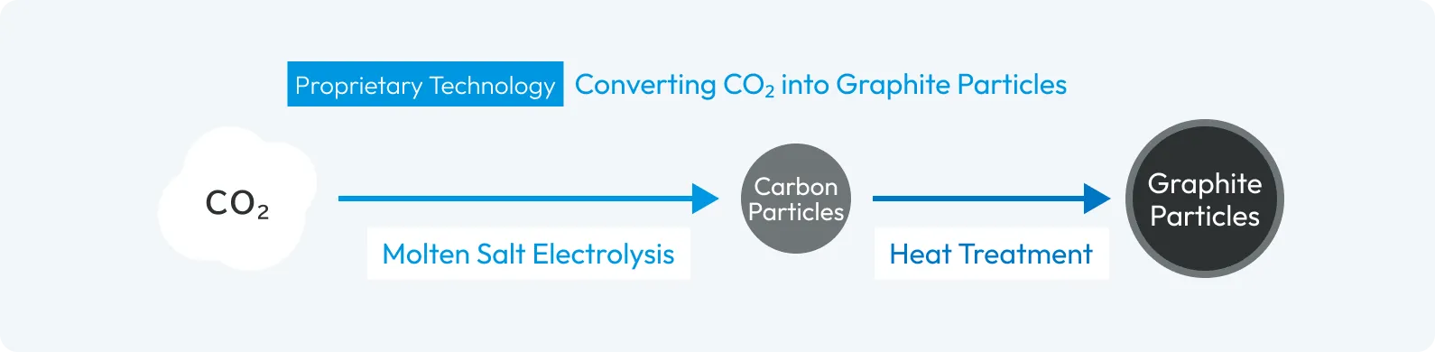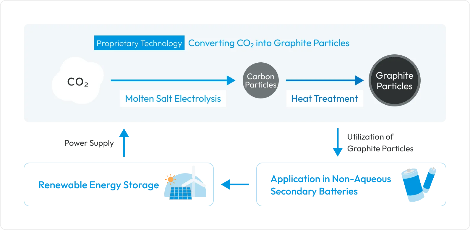 SEC CARBON aims to convert CO₂ emissions from company sites and factories into carbon and graphite particles, contributing to a sustainable carbon and energy-recycling society.